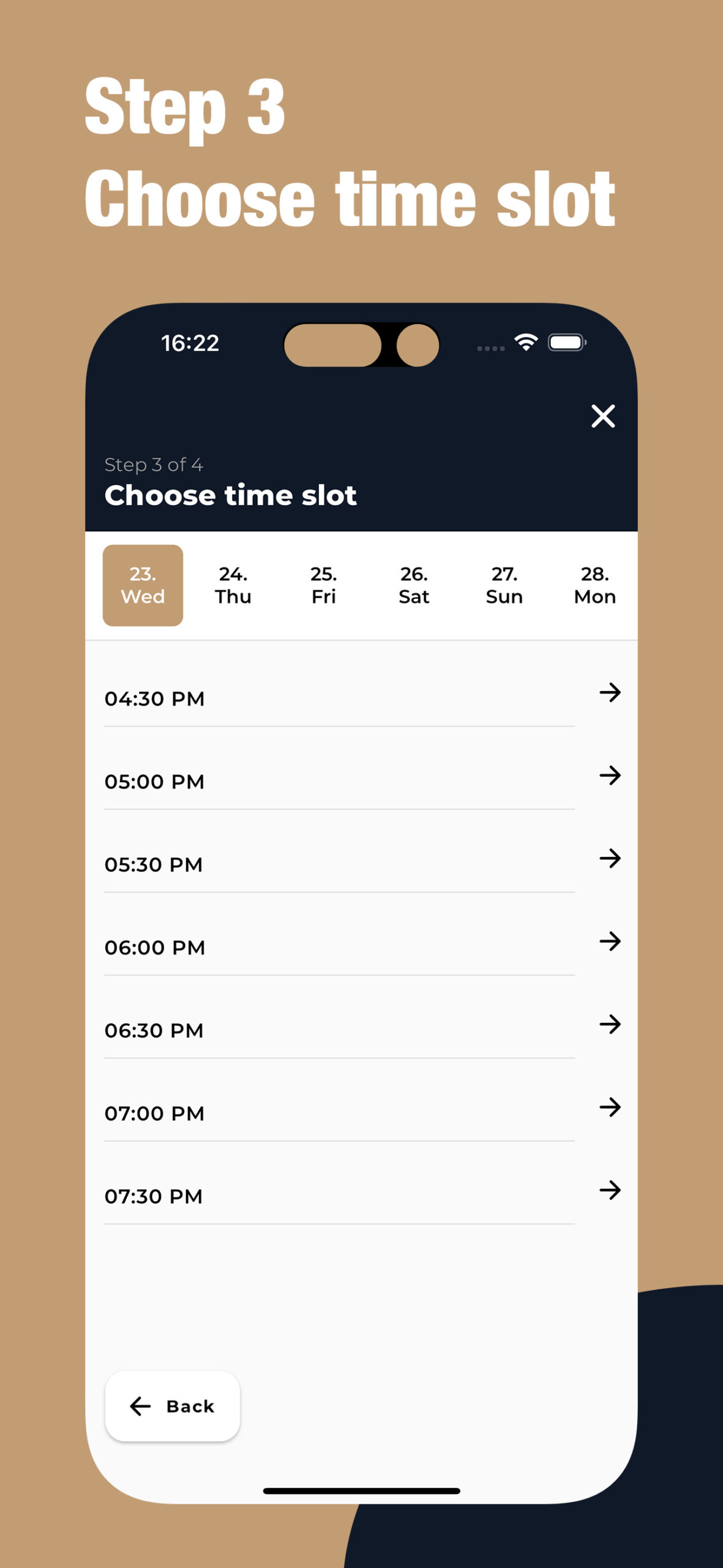 If there are no available time slots for the desired day, the user can join the waiting list. In case of a cancellation, everyone on the list gets notified and can book on a ‘first-come, first-served’ basis 😎